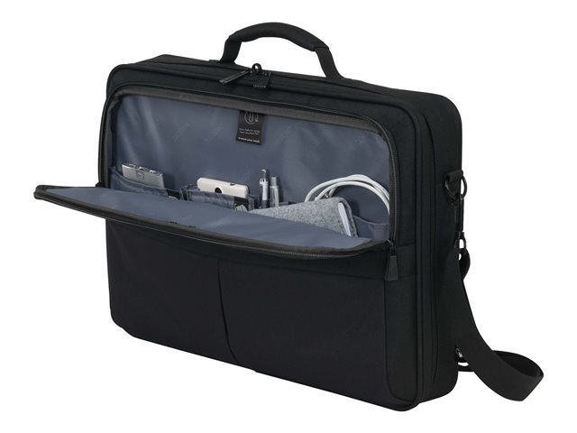 L'Eco Multi SCALE offre une protection excellente pour vos dispositifs et elle est légère et confortable à porter. Conçu pour une utilisation quotidienne. Dispose de fonctions pratiques qui vous facilitent la vie. Dans le compartiment verrouillable, votre ordinateur de 15-17.3" est immédiatement triplement protégé : par un rembourrage optimal en mousse haute densité, un cadre en métal renforcé et une fixation fiable grâce à la courroie de fixation et une cloison de séparation adaptable. Votre tablette jusqu'à 12.9" est également casée en toute sécurité dans sa poche spéciale rembourrée. La poche avant spacieuse permet de mettre de l'ordre avec son compartimentage fonctionnel pour smartphone, batterie externe, stylos et autres accessoires mobiles. Vous pouvez glisser des documents dans le compartiment séparé au dos de la sacoche. La poignée de forme ergonomique et rivetée, une sangle avec renfort rembourré aux épaules réglable en longueur ainsi que la lanière de fixation trolley au dos permettent une utilisation flexible et garantissent un transport confortable. Cela fait du Eco Multi SCALE parfait pour tous ceux qui se déplacent souvent et qui souhaitent soutenir la réutilisation raisonnable des bouteilles en PET grâce à une solution de transport écologique.