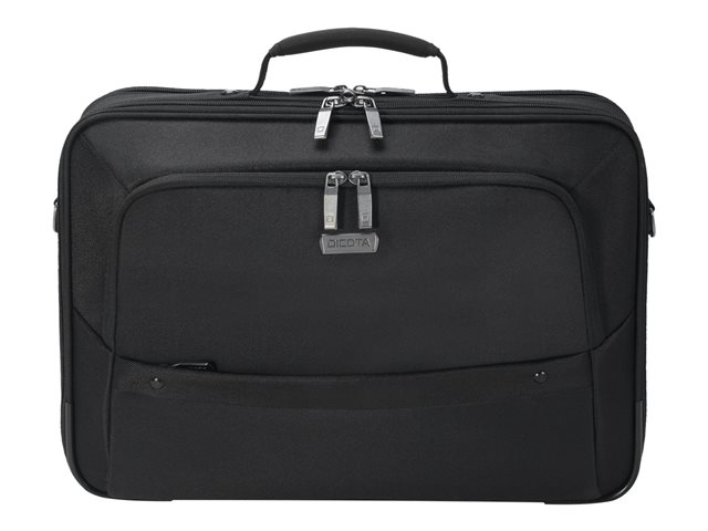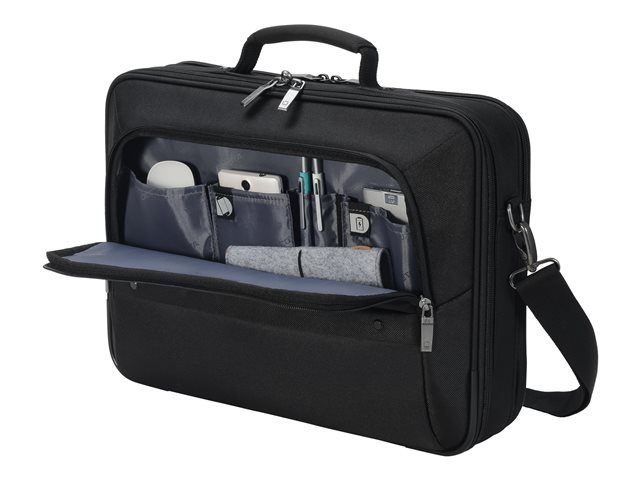 Le compartiment principal refermable à clapet protège votre ordinateur portable de 14 à 15,6" avec un rembourrage complet en mousse haute densité (HDF) et Nylex souple, à un cadre renforcé de métal et à une fixation fiable avec une sangle. Votre tablette jusqu'à 10,5" est également casée en toute sécurité dans sa poche spéciale rembourrée. La poche avant spacieuse permet de mettre de l'ordre avec son compartimentage fonctionnel pour smartphone, batterie externe, stylos et autres accessoires. Un compartiment supplémentaire zippé sur la partie inférieure avant du sac permet de ranger le chargeur et les câbles. La poignée de forme ergonomique et rivetée, une sangle avec renfort rembourré aux épaules réglable en longueur ainsi que la lanière de fixation trolley au dos permettent une utilisation flexible et garantissent un transport confortable.