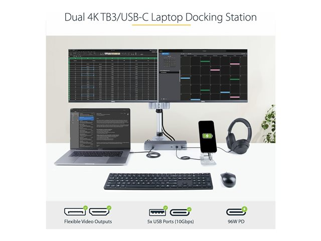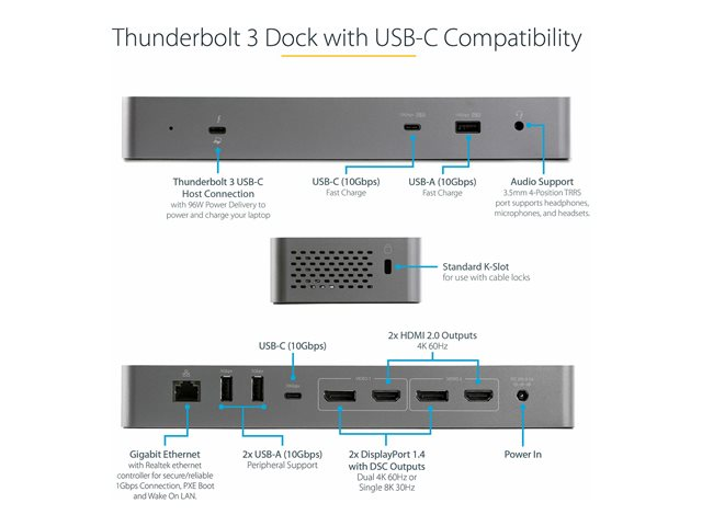 Écrans Double 4K 60Hz DP 1.4 ou Double HDMI - Simple 8K - Station d'Acceuil TB3/USB-C - 96W PD, 5xUSB - 10Gbps (TB3CDK2DHUE) - Station d'accueil - USB-C 3.2 Gen 2 / Thunderbolt 3 - 2 x HDMI, 2 x DP - 1GbE