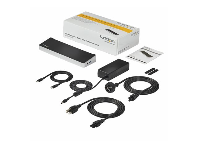 Cette station d'accueil triple-4K pour les ordinateurs portables USB-C Mac, Windows et Chrome fait passer la productivité à la vitesse supérieure. Avec trois connexions vidéo 4K, Power Delivery 100 W et 5 ports USB 3.0, la station d'accueil USB-C est parfaite pour votre MacBook, Dell XPS, Chromebook ou tout autre ordinateur portable USB-C nécessitant des ports supplémentaires. Vous pouvez également connecter la station d'accueil à votre ordinateur portable USB 3.0 à l'aide d'un port USB-A et d'un câble USB-C vers USB-A, tel que le "USB315AC1M" (vendu séparément). Remarque : la charge de votre ordinateur portable par Power Delivery n'est pas disponible par USB-A et seul le double affichage est pris en charge.