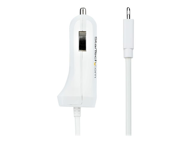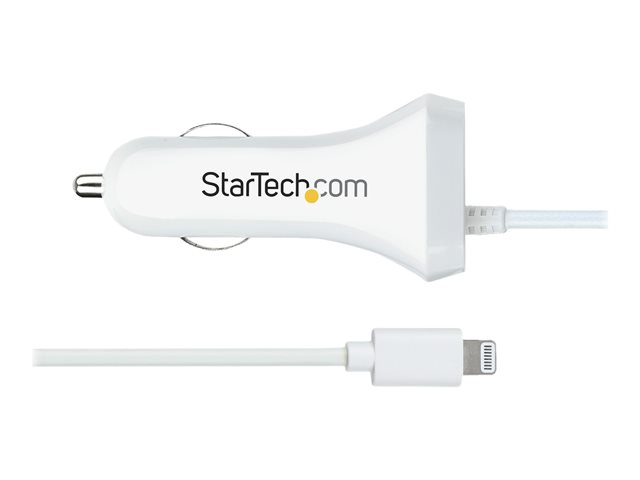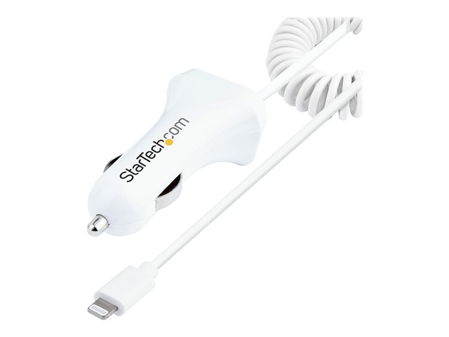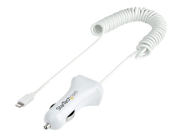 StarTech.com Lightning Car Charger with 1m Coiled Lightning Cable, 12W, White, 2 Port USB Car Charger Adapter for Phones and Tablets, In Car Apple iPhone/iPad Charger w/ Built-in Cord