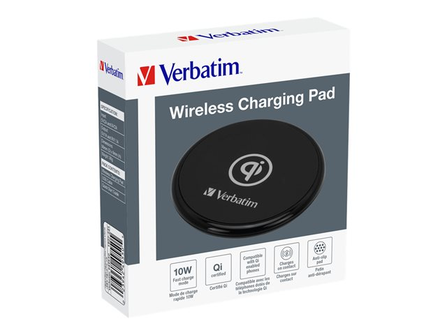 Rechargez d'une autre manière grâce au socle de chargement sans fil de Verbatim. Placez simplement votre téléphone au centre du socle de chargement sans fil et la charge commence instantanément. C'est plus rapide, simple et ordonné que d'utiliser des connecteurs et des câbles physiques. Le chargeur est doté d'une protection contre la surcharge intégrée et se place en mode veille quand la charge est terminée. Certains téléphones peuvent ne pas être compatibles avec ce socle sans fil. Par conséquent, ils devraient être retirés du socle avant le début de la charge.