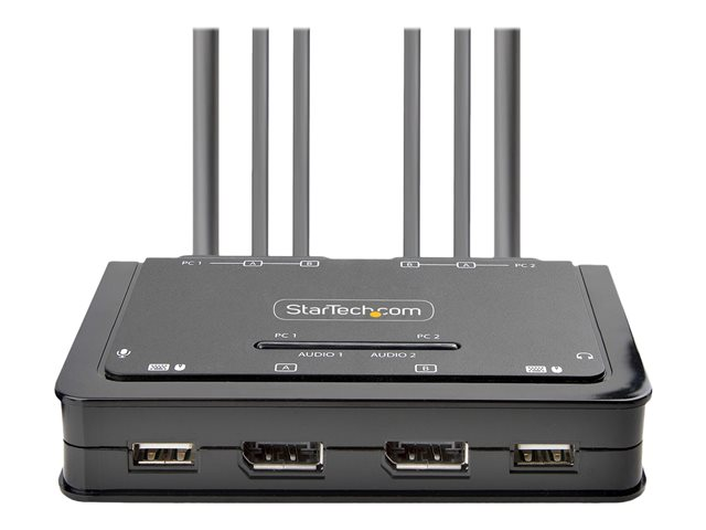 Ce commutateur KVM à deux moniteurs permet aux utilisateurs de basculer entre deux ordinateurs de bureau compatibles USB-A et DisplayPort, en partageant deux moniteurs DisplayPort 4K 60 Hz, un clavier et une souris, ainsi que des périphériques d'entrée/sortie audio.