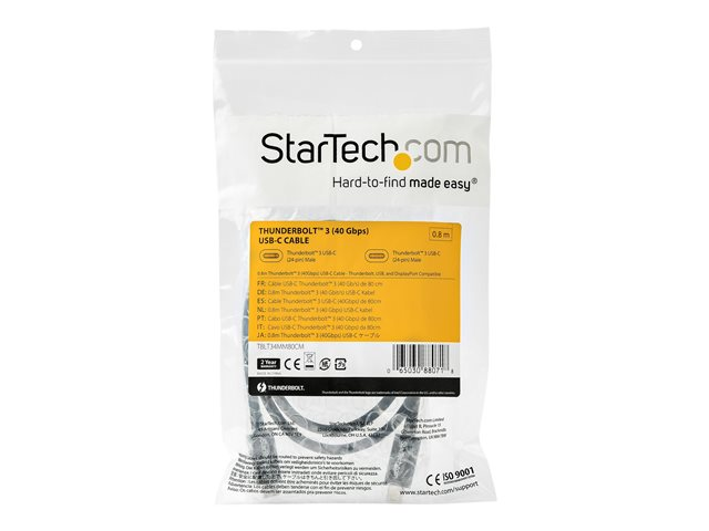 StarTech.com 2.6ft (80cm) Thunderbolt 3 Cable, 40Gbps, 100W PD, 4K/5K Video, Thunderbolt-Certified, Compatible w/ TB4/USB 3.2/DisplayPort - Câble Thunderbolt - 24 pin USB-C (M) pour 24 pin USB-C (M) - Thunderbolt 3 / USB / DisplayPort - 80 cm - support 4K, support 5K - noir - pour P/N: PEXUSB321C TBLT34MM80CM