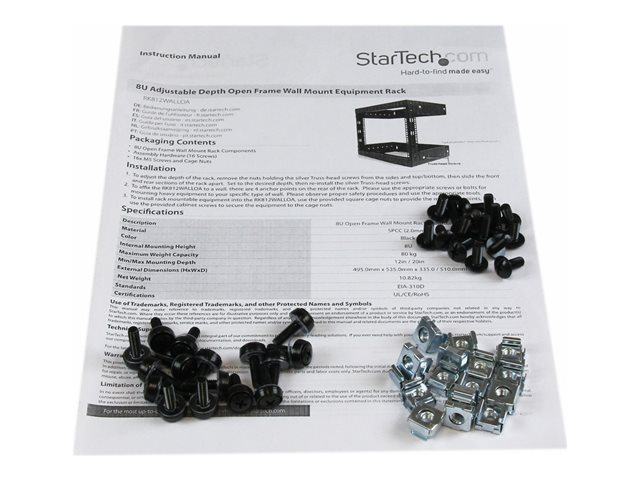 StarTech.com 8U 19" Wall Mount Network Rack - 12" Deep 2 Post Open Frame Server Room Rack for Data/AV/IT/Computer Equipment/Patch Panel with Cage Nuts & Screws 135lb Capacity, Black (RK812WALLO) - Rack - noir - 8U - 19" - pour P/N: CABCAGENUTS6, CABSCREWM52, CABSCREWSM6, CABSCRWM520, CABSCRWM620, CABSCRWS1224